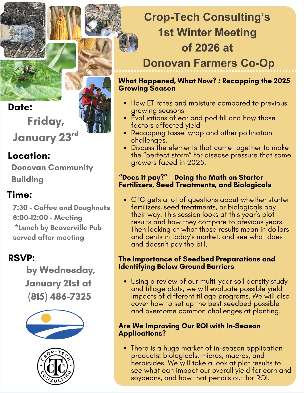 Agronomy Meeting with Ken Ferrie presenting valuable information When Jan 23, 2026, at Donovan Community Building 7:30am coffee and donuts meeting starts at 8 to noon lunch served by Beaverville Pub. You don't want to miss this meeting!! RSVP to Tim or Whitney at 815-486-7377